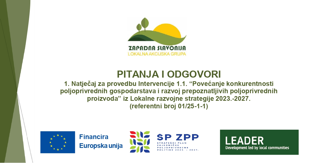 Pitanja i odgovori_1. Natječaj za provedbu Intervencije 1.1. “Povećanje konkurentnosti poljoprivrednih gospodarstava i razvoj prepoznatljivih poljoprivrednih proizvoda” iz Lokalne razvojne strategije 2023.-2027. (referentni broj 01/25-1-1)